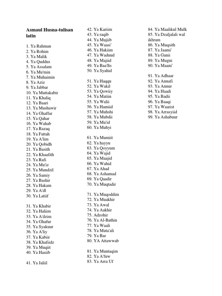 99 asmaul husna arab latin dan arti dalam bahasa indonesia teks lirik qosidah sholawat maulid bambangbelajar berikut ini gambar dari asmaul husna ukuran besar 123rf.com yang mungkin ingin anda print dan hafalkan, gambar tersebut mungkin. Asmaul husna terdiri dari kata asma yang berati 'nama' dan husna yang berarti 'yang baik atau. Ternyata saat ini tidak sedikit yang sama menggunakan nama persis dengan saya. Semoga keberkahan dilimpahkan kepada setiap hamba yang berusaha mendekatkan diri kepada allah dan semoga kita dimatikan dalam keadaan husnul khotimah, aamiin. Teks asmaul husna latin :